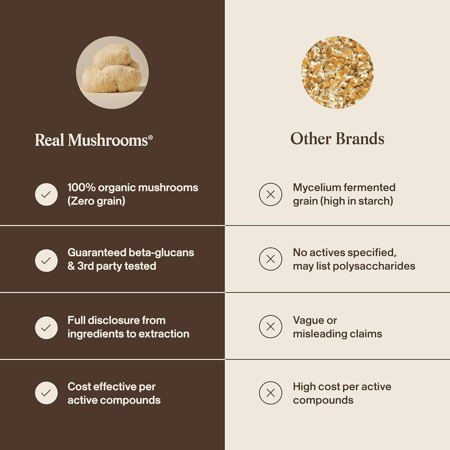 - Organic Mushroom Extract: Our mushroom capsules are only made from 100% mushrooms (fruiting bodies), not mycelium grown on grain like most brands. Contains no starch, grains, or mycelium