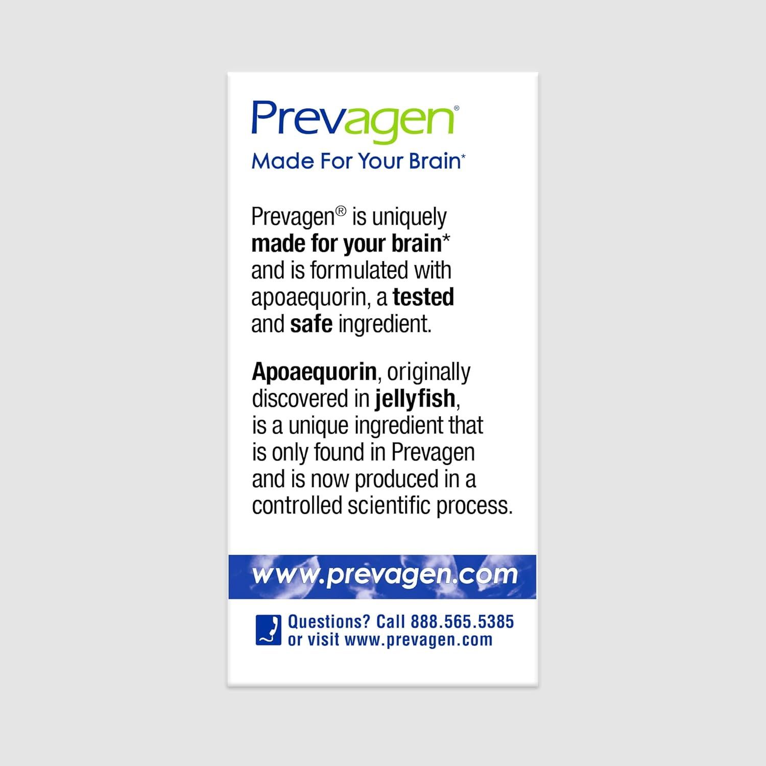 • Unique & Safe Ingredient: Apoaequorin, the unique ingredient in Prevagen, is a supplement formulated for your brain and has undergone extensive Safety Testing. Tests for allergenicity and toxicity have been conducted. Third party experts agree that PREVAGEN IS SAFE.